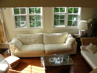 y con un gran sofá de cuero blanco, en éste caso los baños son en una pieza y no